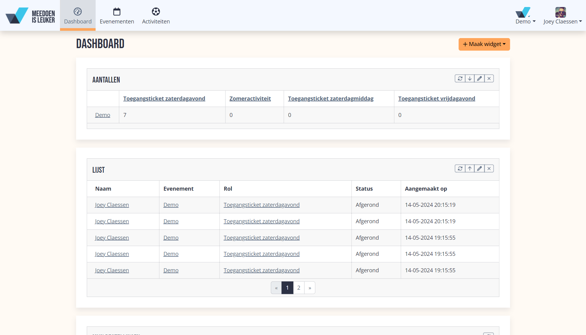 Verschillende organisatie leden hebben verschillende taken waarvoor vaak ook verschillende informatie nodig is. MeeDoenIsLeuker.nl stelt iedere gebruiker in staat haar eigen dashboard samen te stellen.