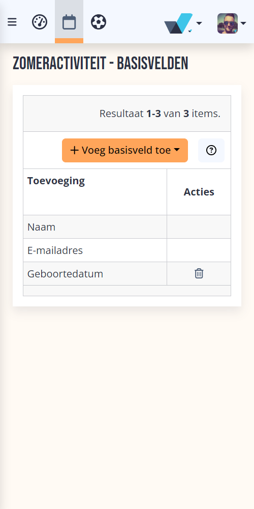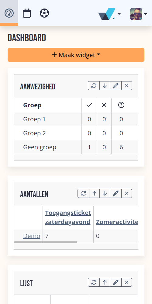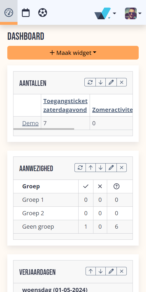 Je kunt zelf widgets toevoegen zoals bijvoorbeeld een lijst of het aantal inschrijvingen, het programma voor een specifieke groep, een overzicht van verjaardagen en nog veel meer.