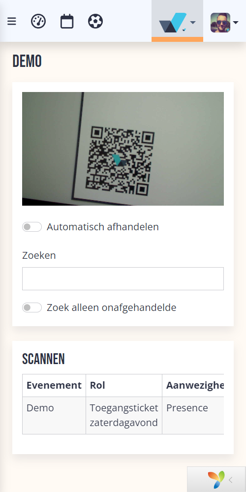 De organisatie kan met een scanner de tickets scannen bij aankomst. Voor de scanner is geen app nodig, maar vindt gewoon plaats in de (mobiele) browser.